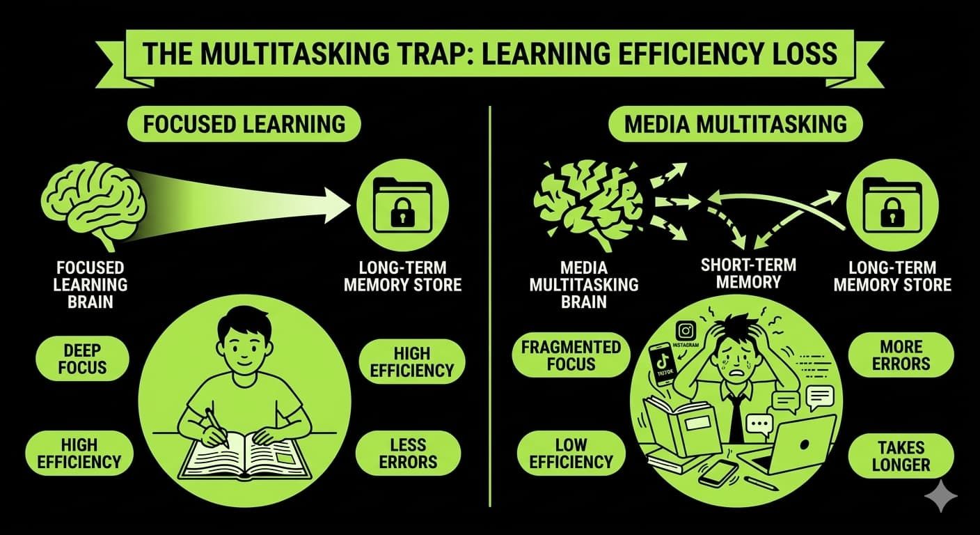 - Frequent switching between tasks makes it harder to move information into long-term memory, which weakens revision and exam prep.