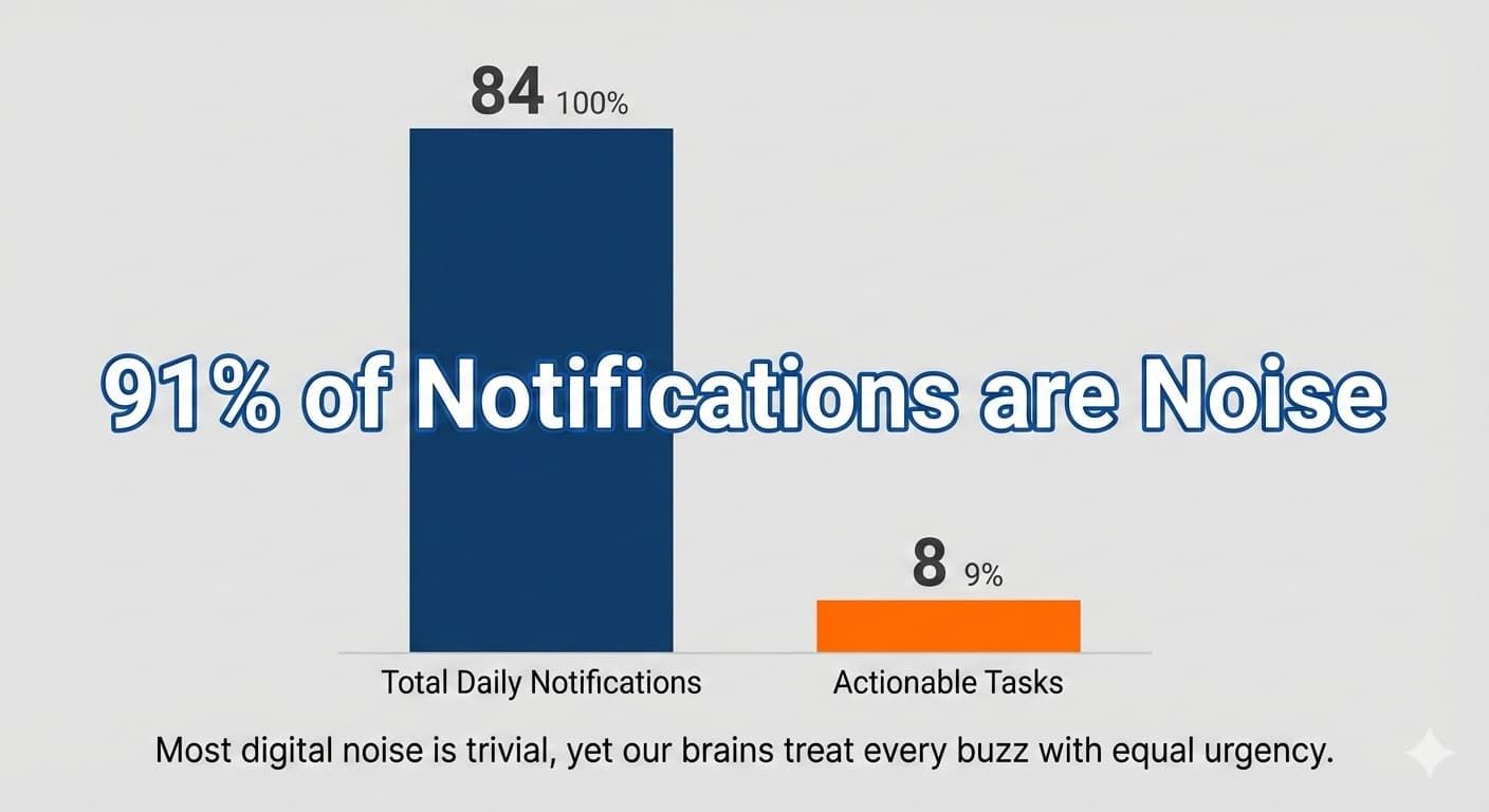 The reality is how employees receive around 84 notifications daily, but only 9% actually require action. Your brain cannot tell the difference between critical and trivial messages.