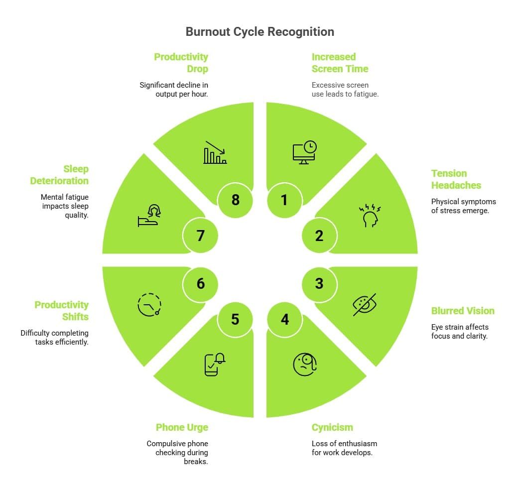 Screen time burnout creeps in through measurable signs most professionals miss. Recognizing these early indicators lets you intervene before full burnout sets in. Here are the key indicators to watch: